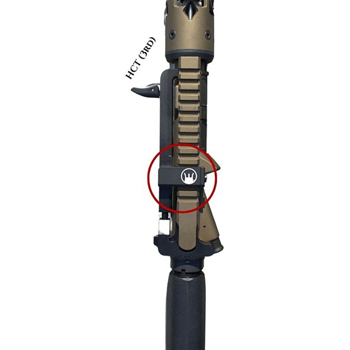 Il manico HCT (Hard Charger® Tactical) si monta sul terzo binario Picatinny ed è progettato per funzionare con ricevitori superiori standard, forgiati e di tipo Mil-Spec. Questo design si colloca tra un mirino di emergenza e un'ottica montata in avanti.