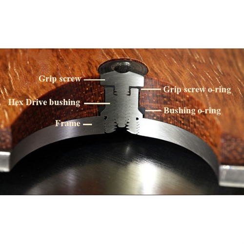 Con lo stesso driver, possono essere facilmente rimossi senza rischi per il telaio o il bushing. A differenza dei modelli tradizionali, i bushings Challis possono essere riutilizzati più volte. I bushings a esagono possono essere dotati di un O-ring opzionale che mantiene le impugnature saldamente in posizione e minimizza gli urti sugli impugnature e sui bushings durante lo sparo.