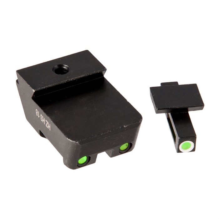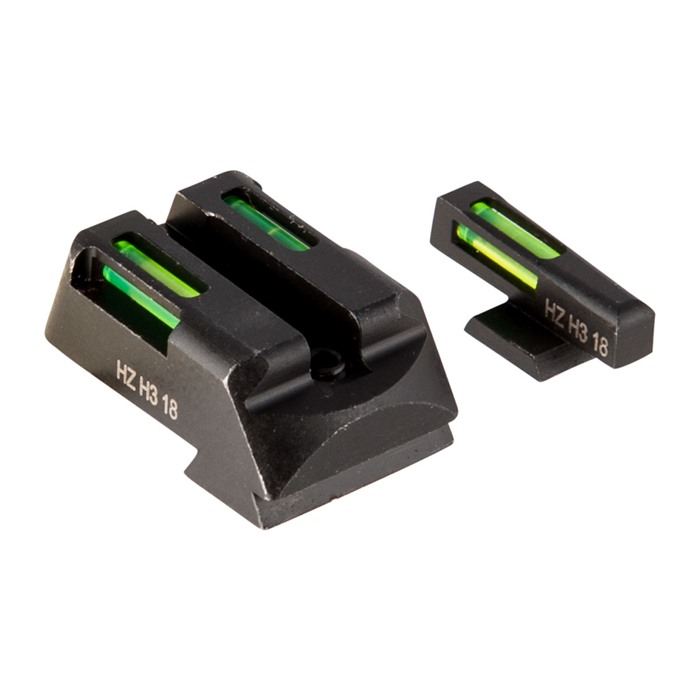 LiteWave H3™ Green Sights from HIVIZ deliver a one-two punch of Tritium and LitePipe fiber optic technology to ensure you can see your pistol's sights 24 hours a day in ANY light conditions. The LitePipe fiber optic rods gather ambient light to produce bright green aiming dots that are as easy to acquire in the sunlight of high noon as in the gathering shadows before sunset. At night, the LiteWave H3™ sights' green self-illuminating Tritium inserts - filled with extra-bright "H3" Tritium gas - take over to maintain full visibility of those three dots. Day or night, a white outline around the front dot helps the shooter distinguish it from the rear dots. Exceptional visibility in ANY light conditions Traditional, intuitive horizontal 3-dot pattern All dots are GREEN - other colors available separately White outline differentiates front dot Steel sight bodies with durable satin black finish Fits factory dovetails Factory height - will not interfere with standard holsters 1911 set fits all Kimber pistols with fixed sights; does not fit Micro Glock models available for standard, large, and G42/43 frame pistols & fit all "Gens" Smith & Wesson M&P fits full-size & compact pistols in all calibers; does not fit CORE, M&P 22 or M&P long slide Springfield XD fits XD, XDS, XDE & XD-M; does not fit XD w/5.25" bbl HIVIZ LiteWave H3™ Green sights are sold as front/rear sight sets and are engineered for a drop-in fit to your pistol's factory slide dovetails (screw holes, in the case of Glocks). Sight bodies are made entirely of steel to ensure thorough protection of the Tritium and fiber optic inserts. Sights are sized for proper clearance in standard holsters for your pistol. Isn't it about time to ride the Wave? Put a set of HIVIZ LiteWave H3™ Green Sights on your pistol, and enjoy the peace of mind you get from knowing whatever the situation you won't lose time trying to find your sights!