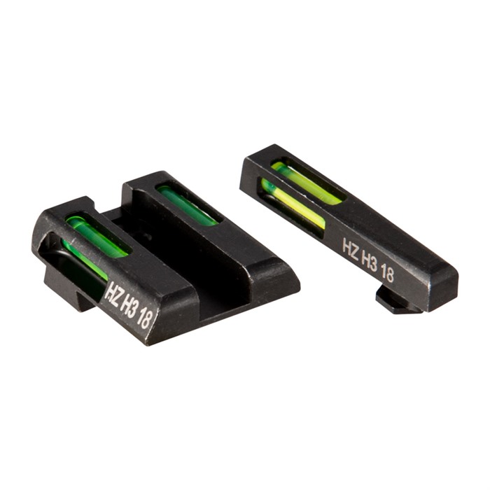 LiteWave H3™ Green Sights from HIVIZ deliver a one-two punch of Tritium and LitePipe fiber optic technology to ensure you can see your pistol's sights 24 hours a day in ANY light conditions. The LitePipe fiber optic rods gather ambient light to produce bright green aiming dots that are as easy to acquire in the sunlight of high noon as in the gathering shadows before sunset. At night, the LiteWave H3™ sights' green self-illuminating Tritium inserts - filled with extra-bright "H3" Tritium gas - take over to maintain full visibility of those three dots. Day or night, a white outline around the front dot helps the shooter distinguish it from the rear dots. Exceptional visibility in ANY light conditions Traditional, intuitive horizontal 3-dot pattern All dots are GREEN - other colors available separately White outline differentiates front dot Steel sight bodies with durable satin black finish Fits factory dovetails Factory height - will not interfere with standard holsters 1911 set fits all Kimber pistols with fixed sights; does not fit Micro Glock models available for standard, large, and G42/43 frame pistols & fit all "Gens" Smith & Wesson M&P fits full-size & compact pistols in all calibers; does not fit CORE, M&P 22 or M&P long slide Springfield XD fits XD, XDS, XDE & XD-M; does not fit XD w/5.25" bbl HIVIZ LiteWave H3™ Green sights are sold as front/rear sight sets and are engineered for a drop-in fit to your pistol's factory slide dovetails (screw holes, in the case of Glocks). Sight bodies are made entirely of steel to ensure thorough protection of the Tritium and fiber optic inserts. Sights are sized for proper clearance in standard holsters for your pistol. Isn't it about time to ride the Wave? Put a set of HIVIZ LiteWave H3™ Green Sights on your pistol, and enjoy the peace of mind you get from knowing whatever the situation you won't lose time trying to find your sights!