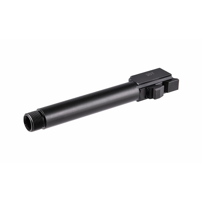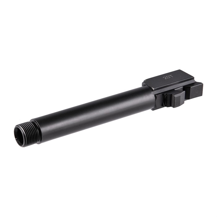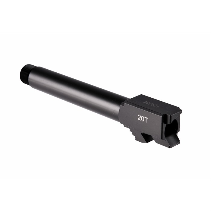 Our Match-Grade Barrel for the Glock® 20 fits ALL generations of G20 It's an excellent replacement for a shot-out factory barrel or for completing a pistol based on the G20 platform. And it's the ideal tube for a custom gun built on a Polymer80 frame with a Brownells Slide on top! Each Brownells Match-Grade Barrel for Glock® 20 is machined from hardened 416R stainless steel to precise dimensions, so it's a drop-in fit on most guns. The tight lockup helps ensure superb accuracy, too. The extra-hard Black Nitride finish resists surface wear and stops in its tracks whatever corrosion might try to challenge the stainless steel. This 9mm Luger (9x19mm) chambered barrel is button-rifled with standard, 1-10" right-hand, 6-groove rifling that is compatible with "practice" ammo with non-jacketed bullets. Fits Glock® 20 Button-rifled 1-10" twist 416R stainless steel Non-reflective Black Nitride anti-corrosion finish Threaded model available with 9/16-24 tpi threads Our match barrel for Glock® 20 is available with either a Plain muzzle with an 11-degree target crown or Threaded (9/16-24 tpi) to enable installation of a compensator or sound suppressor. Both are laser-engraved with the chambering and the Glock model it fits.