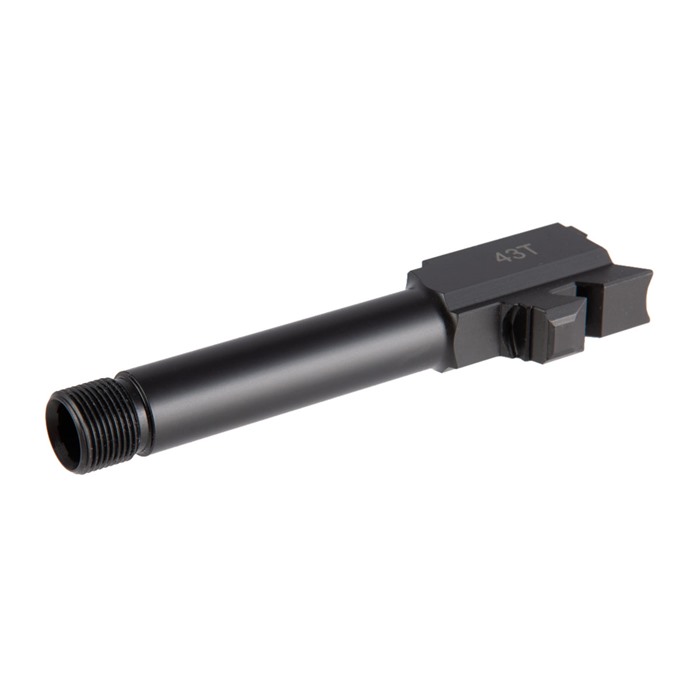 The Glock® 43 is an outstanding EDC / CCW / personal defense pistol. It's not designed to punch the tightest groups on paper targets - but it has a lot more accuracy potential than folks may think. Drop in our Match-Grade Barrel for Glock® 43 and find out just how much more accuracy your G43 is ready to give you! What makes our Glock® 43 barrel match-grade is the way it's machined from hardened 416R stainless steel to precise dimensions for a tight lockup and long service life. Installation should be a straight drop-in deal on most guns. The extra-hard Black Nitride finish resists surface wear and stops in its tracks whatever corrosion might try to challenge the stainless steel. Ahead of the 9mm Luger (9x19mm) chamber is a button-rifled bore with standard, 1-10" right-hand, 6-groove rifling compatible with "practice" ammo with non-jacketed bullets. Fits Glock® 43 ONLY 416R stainless steel Black Nitride finish Button-rifled, 1-10" twist Threaded model has 1/2"-28 tpi threads Our Match-Grade Barrel for the Glock® 43 is available with your choice of a Plain muzzle or Threaded (1/2"-28 tpi) to enable installation of a compensator or sound suppressor. Both are laser engraved with the chambering and the Glock model they fit.