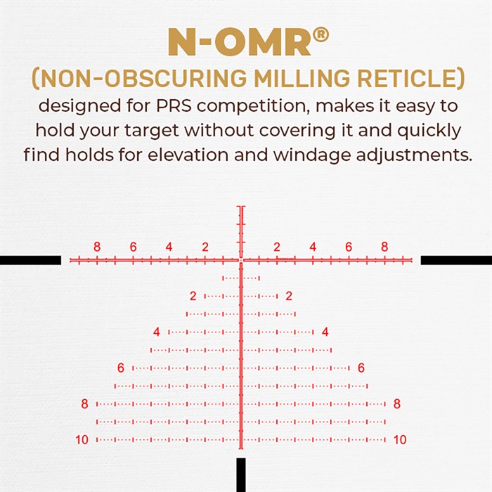 Il Sistema N-OMR® (Non-Obscuring Milling Reticle® System) presenta un incrocio centrale aperto che consente di mantenere il mirino sul bersaglio senza coprirlo. Un ulteriore vantaggio è la sottile doppia linea che aumenta la visibilità del reticolo a bassa ingrandimento. Questo tipo di reticolo è eccellente per le discipline di tiro che richiedono colpi veloci sotto una certa pressione di tempo, o quando sono necessari rapidi colpi di follow-up.