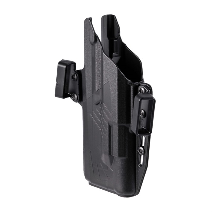 - Curvatura avvolgente: La curvatura del corpo è ottenuta tramite anelli per cintura modulari. Ogni fondina include tre coppie di anelli per cintura da 1.5” (LH 10 gradi, RH 10 gradi e ambi 0 gradi), permettendo all'utente di configurare la fondina per l'uso mancino o destro.
