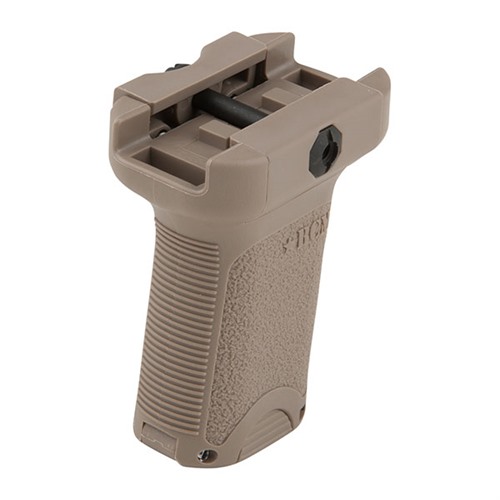 L'impugnatura verticale in polimero si attacca al rail Picatinny per migliorare la gestione e il controllo dell'arma. Il design a bullone incrociato consente l'installazione con strumenti di fortuna, come una moneta o il bordo di una cartuccia, e le morsetti di montaggio sono reversibili.