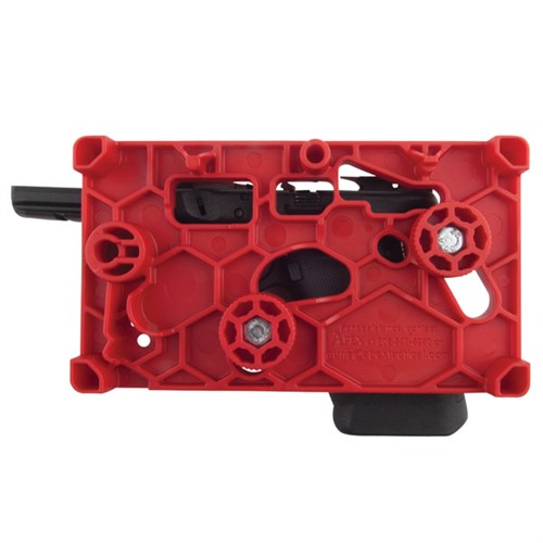 Le fessure di ritenzione su ciascun lato del blocco tengono il striker, rendendo la rimozione e l'installazione della molla del striker un gioco da ragazzi. Un lato è per il striker da 45, mentre l'altro è per i striker da 9/40/357. I bossi mobili sono facilmente regolabili per posizionare i telai in modo rapido e semplice. Le pareti rialzate su ciascun lato del blocco posizionano la trigger bar all'interno del grilletto per un facile cambio del grilletto.