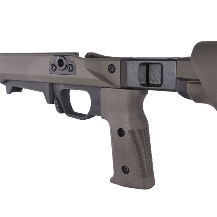 Maintaining the most important features of Magpul’s original Pro 700L, the Pro 700L Lite strikes a balance between features and cost without sacrificing performance. As the name suggests, the Pro 700L Lite blends the original Pro 700L Chassis and the PRS Lite stock to create a simplified rear end with a strong foundation – passing on the value and weight savings to you. The streamlined design weighs in at 4.5 pounds, a full pound less than its predecessor, but still packs a complete set of features that elevate your rifle’s performance. The Pro 700L Lite provides an optimized shooter interface with 0.8” of comb height and 1.4” of LOP adjustments (LOP measures 13.0” -14.4”). The low-profile rubber butt-pad is adjustable for height and cant, providing an extremely stable interface with the shooter’s shoulder. Sling attachment options include an ambidextrous 1.25” footman’s loop, a reversible QD sling swivel cup, and space for another optional QD sling swivel cup. The injection-molded polymer grip has a 5-degree forward edge sweep and enlarged palm swell with a 7-degree aft edge sweep for enhanced user comfort, and it includes a .75” fore/ aft adjustment range using a common hex wrench. An additional grip is included, offering a more aggressive sweep and enlarged palm swell for the shooter who is more inclined to a less vertical grip interface (8-degree forward / 20-degree aft edge sweep). The Pro 700L Lite surrounds its billet-aluminum chassis with Magpul polymer for enhanced ergonomics, strength, and sound mitigation. Built around the user, it is fully ambidextrous at the swap of a bolt retainer plate, and the vertical grip can be adjusted for various trigger reaches. The included large trigger guard can accommodate usage with gloves and aftermarket triggers. The AICS-pattern magazine well features an ambidextrous mag release and has a front barricade stop to prevent the rifle from resting on the magazine when using barricade support. Up front, there are numerous M-LOK slots (left-6 / right-6 / bottom-7) allowing you to mount whatever accessories your loadout calls for. Extremely versatile and adaptable, the Pro 700L Lite turns your long action, 700-pattern rifle into the perfect bolt action precision machine. FEATURES Fully machined aluminum fore end and bedding block AICS compatible bottom metal Vertical grip with adjustment for trigger reach Large trigger guard accommodates gloves and aftermarket triggers Compatible with left and right-handed actions Comb height, LOP, and butt pad adjustment from PRS Lite Injection-molded polymer grip with 5-degree forward edge sweep and enlarged palm swell with 7-degree aft edge sweep for enhanced user comfort combined with a .75” fore/aft adjustment range using a common hex wrench Additional grip option included with a more aggressive sweep and enlarged palm swell for the shooter that is more inclined to a less vertical grip interface (8 degree forward / 20-degree aft edge sweep) Multiple sling attachment points (an ambidextrous 1.25” footman’s loop, a reversible QD sling swivel cup, and a space for another optional QD sling swivel cup Made in the USA COMPATIBILITY Compatible with Remington® 700 Long Action and other Remington 700 Long Action footprints. Buttstock/cheek riser must be removed on the Pro 700L Lite before the user can remove the bolt from the action. Ships with MAG698 (Magnum Long Action AICS 5-round PMAG)