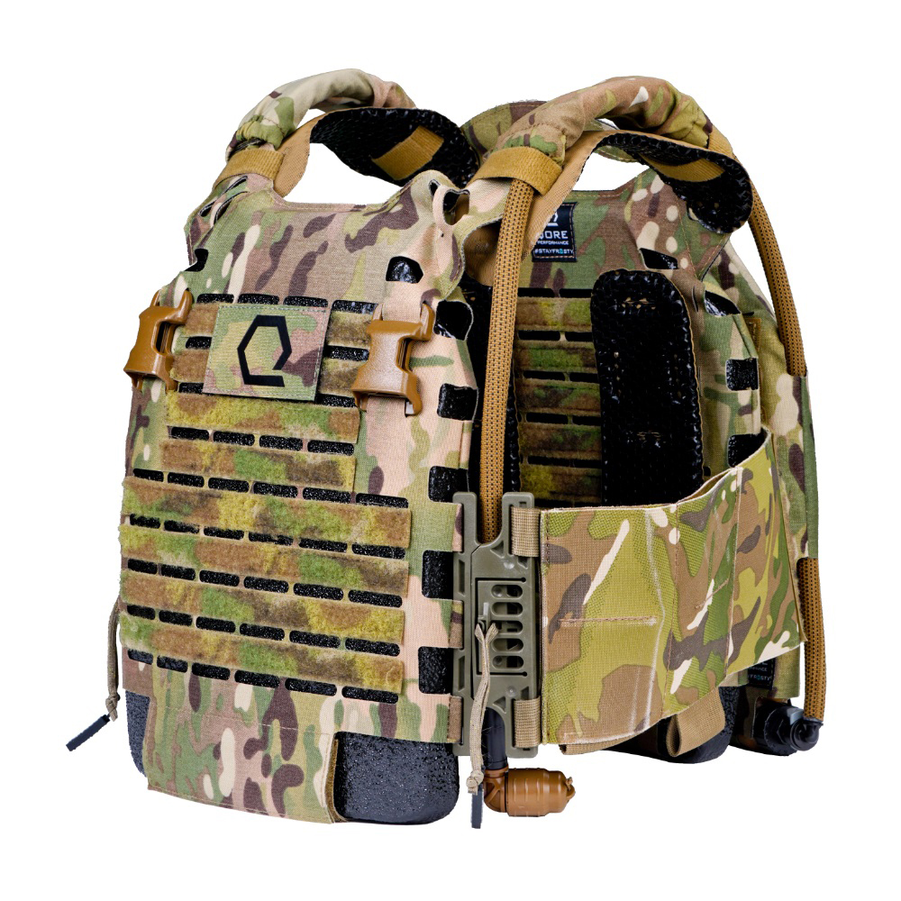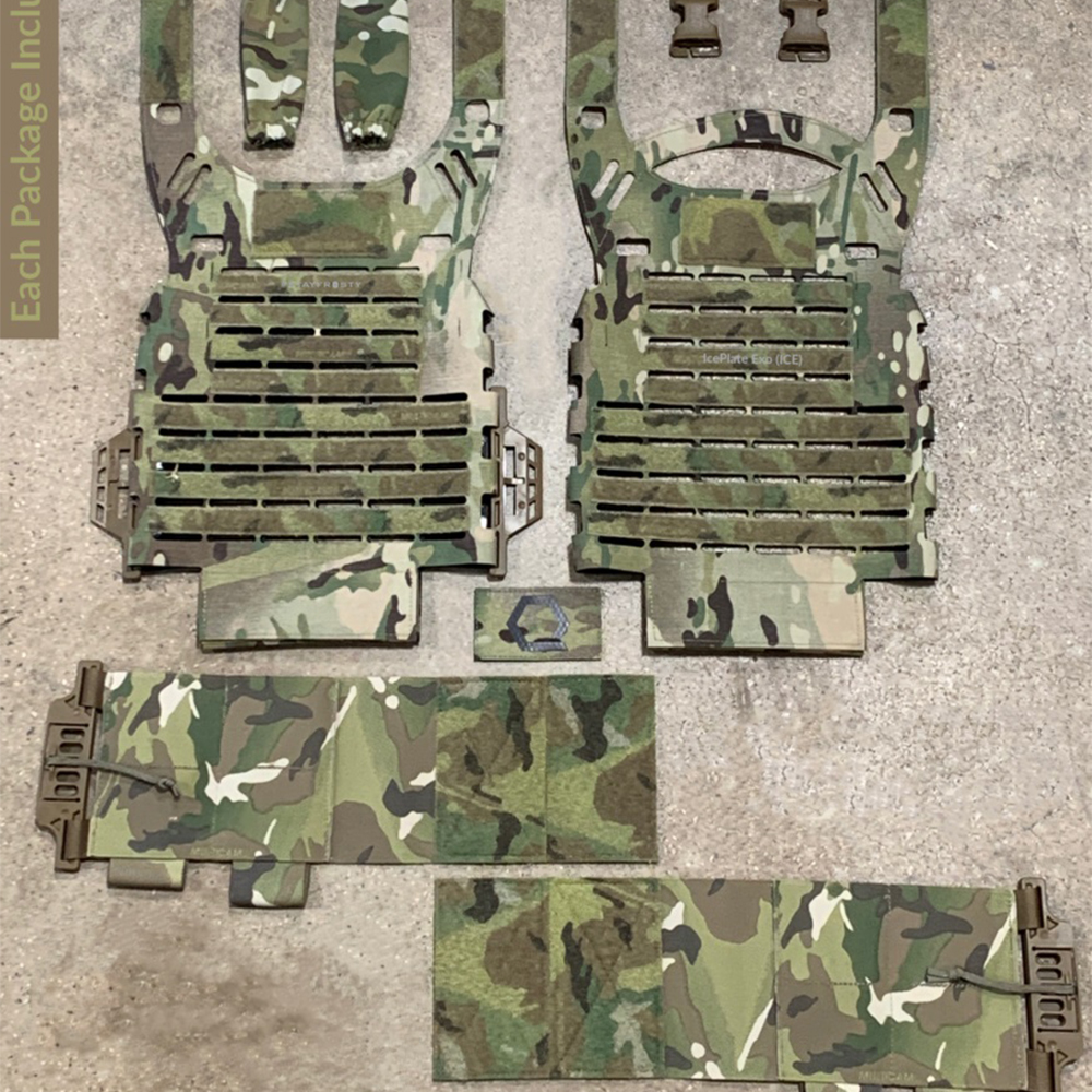 IcePlate EXO (ICE) is a new type of ultra-minimalist, ventilated, multi-role, scalable plate carrier. IcePlate EXO (ICE) anchors our IceAge Ecosystem by combining all of our human performance enhancement and environmental inoculation technologies into an ultra-light, durable, and breathable platform with unrivaled capabilities. IcePlate EXO (ICE) weighs so little yet withstands so much. It furthers our mission of providing American Warfighters, Law Enforcement Officers, Private Security Contractors, and responsible citizens the means of consistently achieving Individual Operator Overmatch -- When Close Counts. Includes:1x ICE Front Sleeve1x ICE Rear Sleeve1x ICE Elastic Cummerbund w/2x 5.56 Mag Pockets per side2x ICE Shoulder Shrouds2x IcePlate PVC Pull Tabs2x Swift Clips1x Laser Cut Q-Hex IR Patch (colors may vary) Specs: Light + Strong Using a unique and incredibly strong laser-cut, high molecular weight polyethylene laminate that is 14 times stronger than steel, ICE weighs just 19 ounces. This makes it one of the lightest plate carriers available today. It is also hydrophobic, cut-resistant and abrasion resistant. MAPs-based Modularity With MAPs (MOLLE Attachment Points) and loop on both the inside and the outside of each sleeve as well as an open-bottom architecture (also accommodates Left Exit and Right Exit IcePlate Curve), ICE is configured for maximum ventilation, modularity and drainage. ICE will not retain water, even under the most intense circumstances. Medium ESAPI Plate Compatible ICE fits Medium ESAPI plates. This design synchronizes with IcePlate Curve to create the thinnest, flattest, toughest and coldest (or hottest) system ever. Evaporative cooling is facilitated by the laser-cut MAPs on the inside of the plate bag, but can also supercharged easily with IceVents. Unparalleled Customization IcePlate Sleeve (coming soon) can be stacked (via MOLLE and/or hook and loop) for streamlined carry of both/either/or ESAPI armor plates and IcePlate Curve. Individual IcePlate Sleeves can also be purchased to MOLLE onto any plate carrier on the market. Don/doff is easy with a flat and durable quick-release system. ICE also features an elastic cummerbund with four pouches for 30-round magazines, SOARescue MedMags, radios, etc. The ICE MOLLE Cummerbund will be backwards compatible with all ICE units. Weight: Ultralight at just 19 ouncesRimosso dal programma
