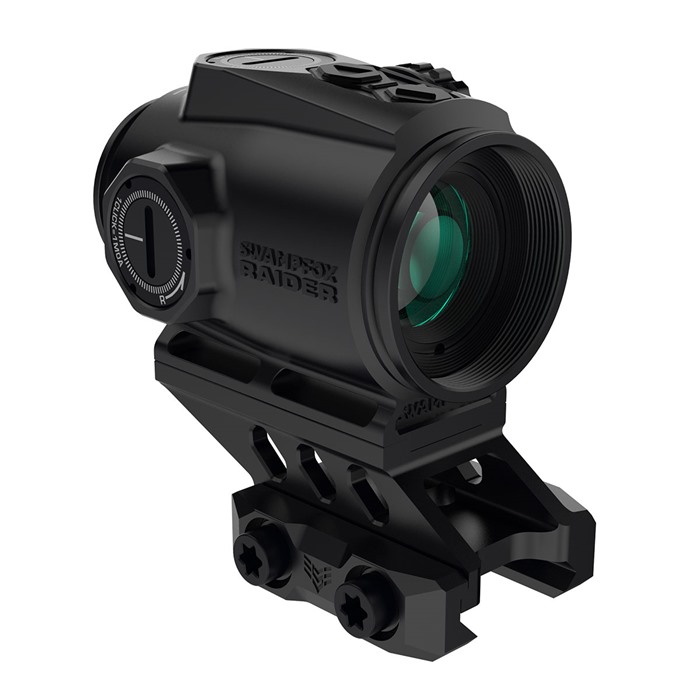 Introducing the Swampfox Raider, a versatile 1x20 micro prism with an expansive eye relief for fast and clear sight acquisition. Using the Bullet Rise Compensating reticle from our Blade prism, Raider has CQB at its heart. Featuring a T-2 footprint for incredible versatility between mounting platforms. This micro prism sets itself apart with a die-cast zinc alloy body presenting a truly tough housing capable of taking hits without loss of function. Available with red and green illumination, Raider’s etched reticle appears black when the illumination is off. Shake N’ Wake motion-sensing auto on/off saves battery life and is perfect for home defense. If you have an issue running a standard red dot, Raider is for you.? FEATURES: Adjustment Click Value: 0.5 MOA Reticle Type: CQB Bullet Rise Compensation Magnification: 1x Lens Diameter: 20mm Illumination Positions: 10 total, 2 NV Brightness Adjustments: Up/Down Digital Press Shockproof G Forces: 1100Gs Waterproof: 1 Meter/ IPX7 Max Battery Life: 15,000 hours Dimensions: 2.56”(length) * 2.05” (width) * 2.23”(height) Weight: 7.58 ounces Lens: Fully Multi Coated Specialty Coatings: Anti-fog, hydrophobic, anti-scratch Parallax: Parallax free @100 yards Eye Relief: 3.5"-4.5" Exit Pupil: 15mm Mount Type: Picatinny Chassis: Die cast zinc alloy Windage/Elevation Movement Range (MOA): '+/- 45MOA/ Total 90MOA Range