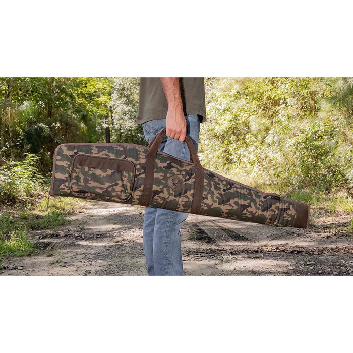 RAWHIDE CLASSIC RIFLE CASE Introducing the Evolution Hunting Rawhide Series Waxed Canvas Classic Camo Rifle Case, a perfect blend of classic style and modern functionality. Crafted from durable waxed cotton canvas, this case is built to withstand the rigors of the outdoors, ensuring long-lasting performance. The antique brass zipper not only provides easy access to your rifle but also adds a touch of timeless elegance to the case. Featuring a leatherette logo patch and a classic camo exterior, this case exudes timeless charm and captures the exhilarating spirit of the hunt. Inside, the faux wool lining offers a plush and protective environment for your rifle, guarding it against scratches and maintaining its pristine condition. The front zippered storage pocket allows you to conveniently store extra accessories, ensuring you have everything you need for a successful hunt. The thick interior foam padding provides maximum impact resistance, offering reliable protection for your shotgun during your rugged hunting adventure. Level up your hunting gear with the Rawhide Series Waxed Canvas Classic Camo Rifle Case and its ultimate fusion of timeless style and ultimate protection. Fits most standard rifles with a scope. FEATURES: Durable waxed cotton canvas Antique brass zipper Leatherette logo patch Interior Faux Wool Lining Front zippered storage pocket Classic Camo Exterior Thick interior foam padding for maximum impact resistance SPECIFICATIONS: 1.5” inch webbing straps Size : 48” L x 10.50” H (Inner Dimensions: 46" Length)