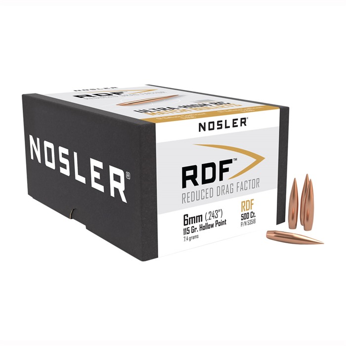 Flattest Shooting Match Bullet On The Market For those wanting to squeeze the most performance from their competition rifle, Nosler’s new RDF (Reduced Drag Factor) match bullet line is the ideal choice. Nosler’s RDF line was designed from the ground up to provide exceptionally high BCs, which create the flattest trajectory and least wind drift possible. The keys to the RDF’s outstanding performance are Nosler’s meticulously optimized compound ogive and long, drag reducing boattail, which make handloading a snap and create an incredibly sleek form factor. RDF bullets also have the smallest, most consistent meplats of any hollow point match bullet line, so there is no need to point or trim tips. Highest B.C.’s, smallest meplat, tighter groups – Nosler RDF.