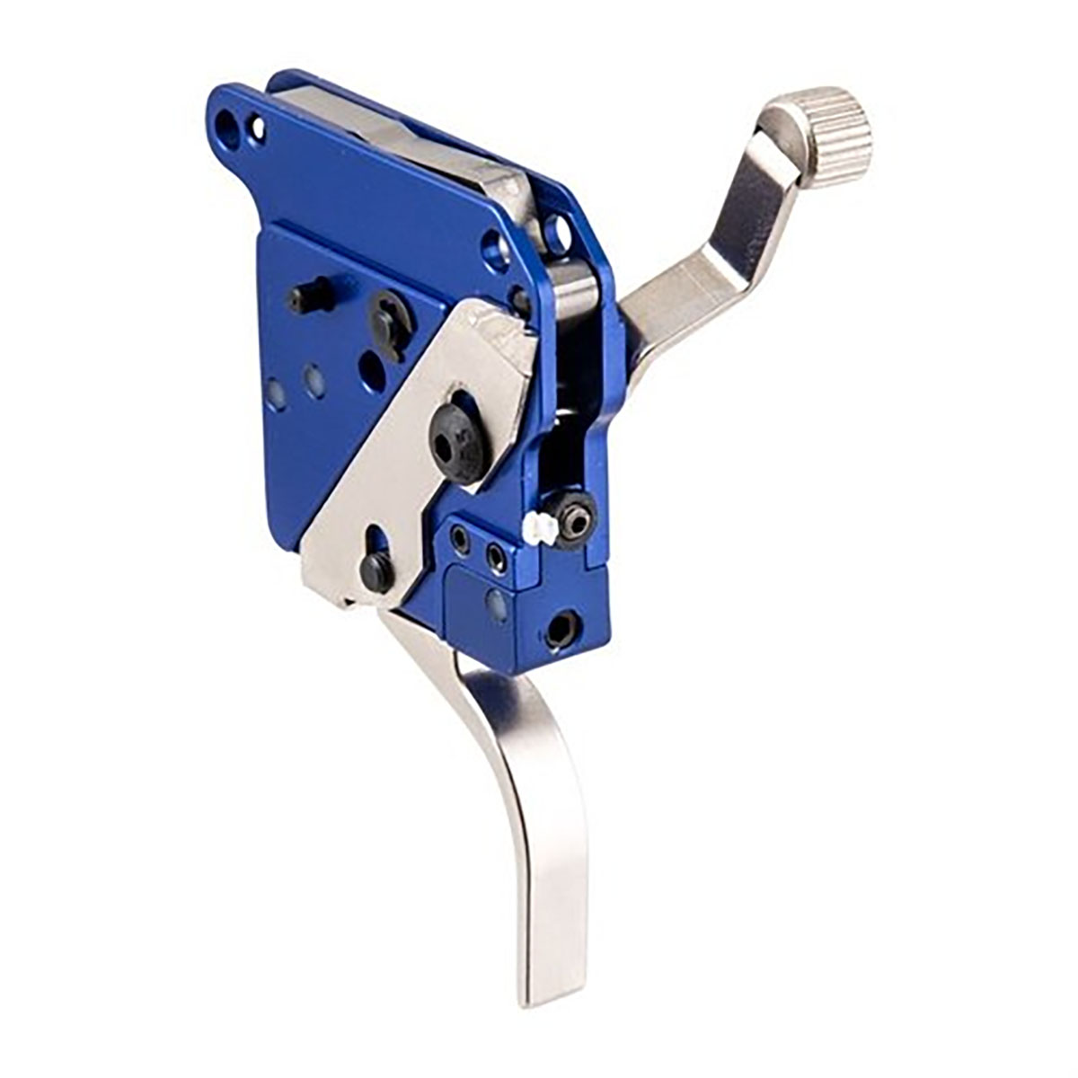081950532476 Self-contained drop in trigger. Lightweight 6061-T6 CNC Machined aluminum housing with Wire EDM cut, Heat treated Tool steel trigger and sears. Featuring a double sear design. Timney Golden Elite colored housing. Two position, trigger blocking side safety. Fully adjustable Sear Engagement, Over-travel, and pull weight from 8oz.-2.5lbs. Available in blue(black) and Nickel Plated. Teflon nickel coated Sears to guarantee a lifetime of reliable service.