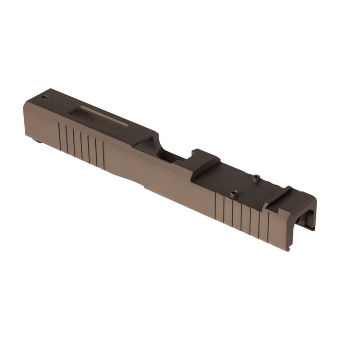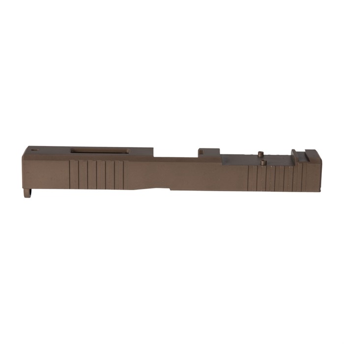 The limited production Brownells Brown RMR Slide for Glock® 19 Gen3 pistols features a pre-cut slot for easy, secure, low-profile mounting of a Trijicon RMR or Holosun red dot sight. Up front, there are distinctive, cocking serrations that aid in manipulating the slide to check the chamber or clear a jam. And we’ll admit it: the serrations just look cool, too. All RMR Slides also have standard Glock® factory front and rear sight dovetails for "iron" sights. To get proper co-witnessing with the RMR, you will need to also install suppressor-height iron sights. These limited production Brownells Brown slides for the Glock® 19 Gen3 come with a "window" cutout on top between the front serrations that enhances airflow to keep the barrel cooler - ideal for hard-working action competition pistols. Plus, if you have an upgraded barrel with a contrasting finish or a unique exterior pattern (fluting, spirals, "flames," etc.) the window lets you show it off a bit! A Brownells RMR Slide is the ideal upgrade for your factory Glock® 19 Gen3 OR the perfect "top half" for a brand-new custom gun built on a Polymer80 80% frame. Fits Gen3 Glock® 19 pistols & clones Built-in Trijicon RMR mounting slot Also accepts Holosun HE508T, HS507C & HS407C red dot sights Factory front/rear iron sight cuts, too Machined from corrosion-resistant 17-4 stainless steel billet Each RMR Slide for Glock® starts life as a billet of 17-4 stainless steel that is machined to Glock® factory specifications inside, so it’ll accept factory or aftermarket barrels and internal parts. Each slide is heat-treated to Rc 41-44 on the Rockwell C scale for added surface hardness and wear resistance. The Brownells Brown slide is a limited production and once they are gone, they’re gone. Brownells Gun Tech™ Note: Channel liner required for these slides. Channel liner is a press fit and requires a tool to install. We recommend #777-100-017. Includes patented optic cut technology pioneered by ZEV Technologies. Patent No. RE47335