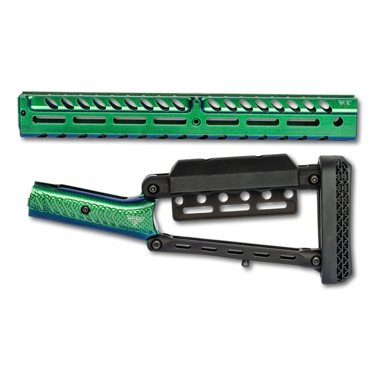 850078134806 1. Ranger Point Forearm Handguard was designed to provide lever gun shooters with exceptional flexibility in setup and cost while safeguarding the qualities of lightweight handling and accuracy that we love about these fine firearms. FEATURES: 13.25" length handguard: Grippy cutouts, M-LOK accessory slots sides/bottom, QD swivel sling holes, traditional sling stud threaded hole. MATERIAL: 6061-T6 aluminum COATING: BLUE/GREEN HYPERSHIFT CERAKOTE MOUNTING SCREWS: Barrel Band with attachment screws, four mounting set screws 2. Ranger Point Adjustable Butt Stock - Tough, robust, and weatherproof made of 6061 billet aluminum - Lightweight at only 22 oz, less than the factory wood stock; keeps rifle perfectly balanced - Comparable length-of-pull (LOP) to factory rifles; 1/2" spacers for longer LOP - Adjustable comb height using four pivot points (adjust, and tighten when set) for open sights, red dots, and scopes - AR-style 6-Position butt plate design with our proprietary "Made in Texas" DEAD BLOW recoil pad; also works with off the shelf AR pads - Sling & Accessory attachment options: a) Flush cup holes for push button swivel (underside, bottom strut) b) GrovTec standard sling swivel stud (installed) c) Accessory Panel with sling flush cups and M-LOK slots d) Holes on upper strut for an AR-Height Optics cheek riser