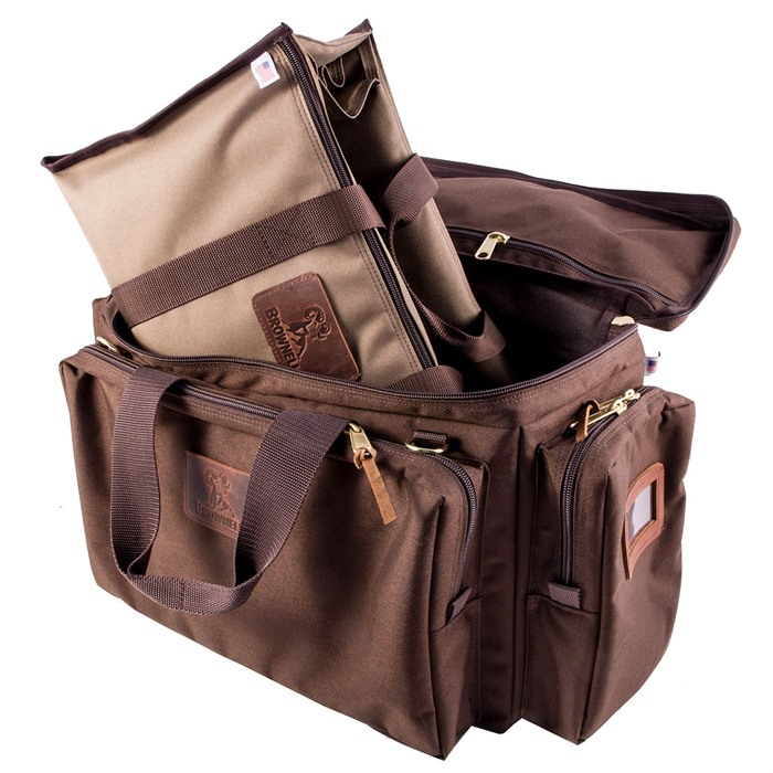 We’ve taken the suggestions our customers have given us at the matches, those of competitive, pro-circuit, competition shooters, and added in the “gotta-haves” from the shooters on our own staff to come up with the best range bag we’ve ever seen. Designing such a bag was no easy task. And, we tossed around quite a collection of “good” prototypes before opening the red curtain on this work of art. In fact, we’re so proud of it, we had our logo branded in leather and sewn right on the front of the bag. Simply put…this is the bag, when only the best will do! We hand picked only the finest quality materials for minimal weight and maximum ruggedness, then selected a skilled supplier to provide the careful construction and attention to detail you’ve come to know and expect from Brownells. The Signature Series Range Bag is a versatile, two-in-one bag system featuring a roomy, outer bag with large exterior, bellow pockets and an inner, open bag with adjustable dividers, padded pistol inserts, magazine pouches and much, much more. Both bags are constructed of long lasting, 1000 denier, Cordura® nylon with non-scratching, self-healing, YKK zippers and solid brass pulls. We even added stylish, top-grain, leather straps to the zipper pulls where needed to make opening and closing the “high-use” compartments easier when wearing shooting gloves. Adjustable shoulder strap is made of strong, 1½" wide nylon webbing and includes a comfortable pad lined with non-slip, suede leather. Quickly detachable, brass-plated swivel clips are springloaded for extra security and allow shoulder strap to be interchanged between inner and outer bags. Inner bag provides safe transport for match pistols when you don’t want to leave them in your competition holster. Use the inner bag to carry just what you need to the firing line and for fast “bag-up” after shooting. If you have a lot of gear, use the bags separately for nearly twice the storage capacity. The double-layered, 3/8" thick, corrugated bottom panels in both bags give full support for heavy loads of ammunition, pistols, tools, sandbags and other shooting accessories while retaining the original shape of the bag. The Signature Series is a full-featured bag, designed to perform and built to last. Outer Bag: Moisture-resistant, 1000 denier, Cordura nylon Large, main compartment with zippered top, measures 18" long, 9" wide, 12" high Zippered, main, side pocket: 17" long, 2½" wide, 10" high. Holds shooting glasses, muffs, and cleaning supplies Two, padded end pockets 7" long, 2½" wide, 10" high provide ample room for choke tubes, spare parts, etc Two, flat, zippered pockets 18" long, 7" and 8" high for targets, notebooks, ballistic sheets, etc. Four, brass-plated D-rings provide lockable storage when used with your own padlocks Adjustable shoulder strap with polished, quick-release, swivel clips 2" wide, wrap-around carry handles with contoured grip area and hook and loop carry handle Self-healing zippers and solid brass, #9 zipper pulls Full 3/8" thick, bottom panel is composed of two, corrugated, double-wall, plastic sheets glued, then layered in opposite directions for superior strength and rigidity Inner Bag: 1000 denier, Cordura nylon with knit back, expanded vinyl lining for excellent water-resistance Two, fully padded pistol inserts and hook and loop closure straps fit inside the full-length, zippered side pockets for extra security. Accepts scoped, competition guns, spotting scopes, etc Two, removable, high-strength, plastic dividers with reinforced hook and loop edging for spacing adjustments; provides up to three individual compartments Brass-plated D-rings for shoulder strap attachment 3/8" thick, double-layered, bottom panel supports the heaviest gear Padded end panels for extra protection of inner bag contents Six, individually sewn, magazine pouches Self-healing zippers and solid brass, #9 zipper pulls Two, elastic, retaining straps for shooting towels, extra ammo and magazines