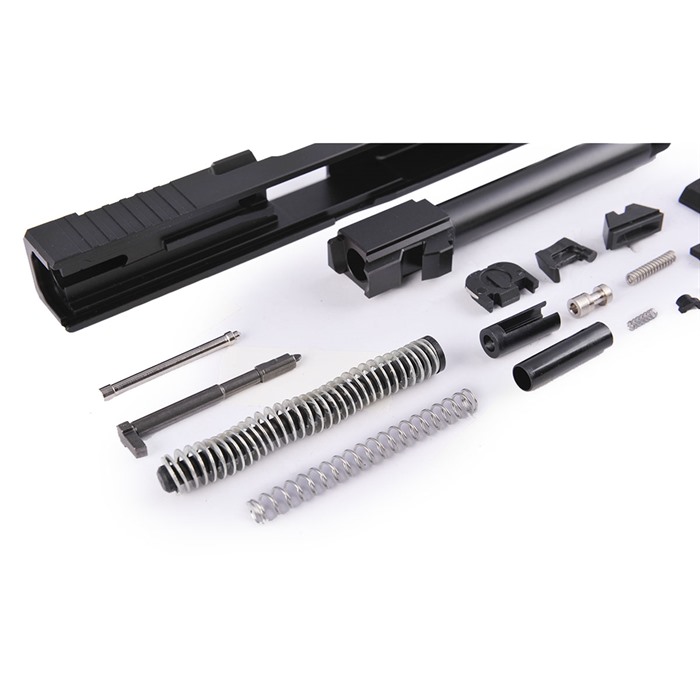 The perfect set to build your own Glock 17~. Choose from the Brownells threaded on non-threaded barrels as well as a standard slide or a windowed slide. All sets come with an RMR Cut Slide, Barrel, RMR Plate, Sights, and a Parts Kit to finish out the slide for your build! The limited production Brownells Brown RMR Slide for Glock® 17 Gen3 pistols features a pre-cut slot for easy, secure, low-profile mounting of a Trijicon RMR or Holosun red dot sight. Up front, there are distinctive, cocking serrations that aid in manipulating the slide to check the chamber or clear a jam. And we’ll admit it: the serrations just look cool, too. All RMR Slides also have standard Glock® factory front and rear sight dovetails for "iron" sights. To get proper co-witnessing with the RMR, you will need to also install suppressor-height iron sights. These limited production Brownells Brown slides for the Glock® 17 Gen3 come with a "window" cutout on top between the front serrations that enhances airflow to keep the barrel cooler - ideal for hard-working action competition pistols. Plus, if you have an upgraded barrel with a contrasting finish or a unique exterior pattern (fluting, spirals, "flames," etc.) the window lets you show it off a bit! A Brownells RMR Slide is the ideal upgrade for your factory Glock® 17 Gen3 OR the perfect "top half" for a brand-new custom gun built on a Polymer80 80% frame. Fits Gen3 Glock® 17 pistols & clones Built-in Trijicon RMR mounting slot Also accepts Holosun HE508T, HS507C & HS407C red dot sights Factory front/rear iron sight cuts, too Machined from corrosion-resistant 17-4 stainless steel billet Each RMR Slide for Glock® starts life as a billet of 17-4 stainless steel that is machined to Glock® factory specifications inside, so it’ll accept factory or aftermarket barrels and internal parts. Each slide is heat-treated to Rc 41-44 on the Rockwell C scale for added surface hardness and wear resistance. The Brownells Brown slide is a limited production and once they are gone, they’re gone. Brownells Gun Tech™ Note: Channel liner required for these slides. Channel liner is a press fit and requires a tool to install. We recommend #777-100-017. Includes patented optic cut technology pioneered by ZEV Technologies. Patent No. RE47335 Our Match-Grade Barrel for the Glock® 17 fits ALL generations of G17, Gen1 through Gen5. It's an excellent replacement for a shot-out factory barrel or for completing a pistol based on the G17 platform. And it's the ideal tube for a custom gun built on a Polymer80 frame with a Brownells RMR Slide on top! Each Brownells Match-Grade Barrel for Glock® 17 is machined from hardened 416R stainless steel to precise dimensions, so it's a drop-in fit on most guns. The tight lockup helps ensure superb accuracy, too. The extra-hard Black Nitride finish resists surface wear and stops in its tracks whatever corrosion might try to challenge the stainless steel. This 9mm Luger (9x17mm) chambered barrel is button-rifled with standard, 1-10" right-hand, 6-groove rifling that is compatible with "practice" ammo with non-jacketed bullets. Fits Glock® 17 Gen1 thru Gen5 Button-rifled 1-10" twist 416R stainless steel Non-reflective Black Nitride anti-corrosion finish Threaded model available with 1/2"-28 tpi threads Our match barrel for Glock® 17 is available with either a Plain muzzle with an 11-degree target crown or Threaded (1/2"-28 tpi) to enable installation of a compensator or sound suppressor. Both are laser-engraved with the chambering and the Glock model it fits.