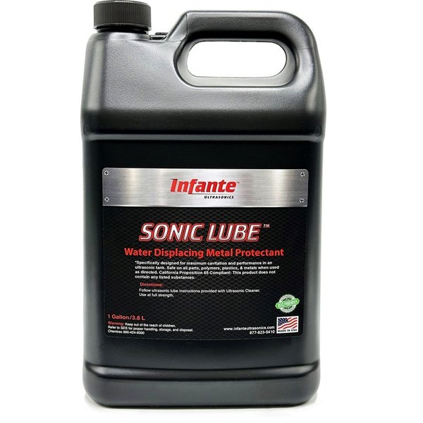 Il SONIC LUBE WATER DISPLACING METAL PROTECTANT di INFANTE ULTRASONICS è una formulazione altamente ingegnerizzata, conforme alla Prop.65, specificamente progettata per l'uso in vasche ad ultrasuoni per la dislocazione dell'acqua, la protezione dei componenti delle armi da fuoco e la prevenzione della ruggine.