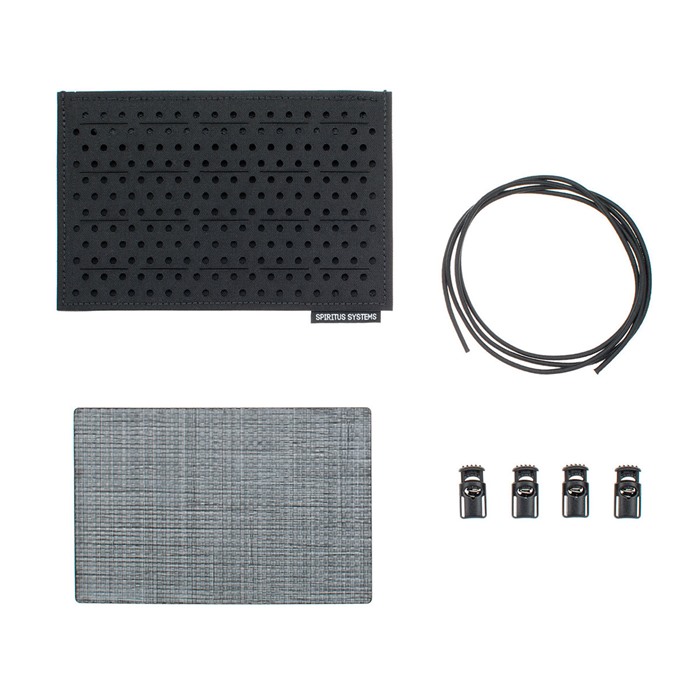 Configurable Med Tray Insert The Spiritus Systems Configurable Med Tray is a modular insert board with Velcro hook backing and a removable rigid Tegris insert that allows you efficiently organize and secure small items in a pouch. The Configurable Med Tray is built with a laser cut face that features both dot grid and MOLLE mounting options. Layout of the tray is entirely up to you and can be assembled to hold nearly anything with the included shock cord and cord locks. The tray is sized to mount to the inside of many Spiritus Systems pouches, including the GP Medium, JSTA Pouch, Mutant Pouch, GP Tall, GP Wide, and SACK pouches. Once configured, the hook & loop backing in the tray will keep your kit locked down to the inside wall of the pouch, mitigating unwanted noise from items that jostle during movement, and reducing the time it takes to find what you need under stress. The Tegris backer sleeve can also be used to store flat items like bandages, notes, and other thin equipment. The Configurable Med Tray Insert measures 7" wide x 4.5" tall and comes with 4 cord locks and 4’ of shock cord that can be cut to length. Some images shown with optional accessories, sold separately.