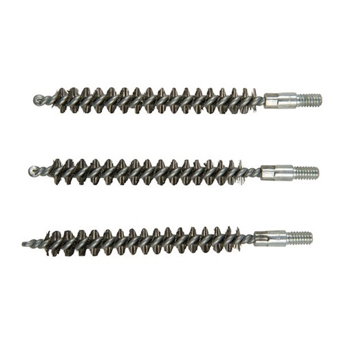 Since darn near as many bore brushes get used in the shop as get sold, we’ve packed these custom-made, top quality brushes in bulk paks to make them more convenient and less expensive. The shank is one-piece, looped and wound (not two, twisted together and chopped off). Stainless Steel Bore Brush - For severely leaded, fouled or rusted bores, the aggressive cleaning action of a stainless steel brush can help get them clean. However, the aggressive action accelerates wear, and regular use can shorten barrel life. SPECS: Bristles: Available in stainless steel. Shank: Steel, looped and wound. Overall length: 3.27" (8.3cm) Threads: .17 and.20 cal. 5-40 threads, all others 8-32 thread.