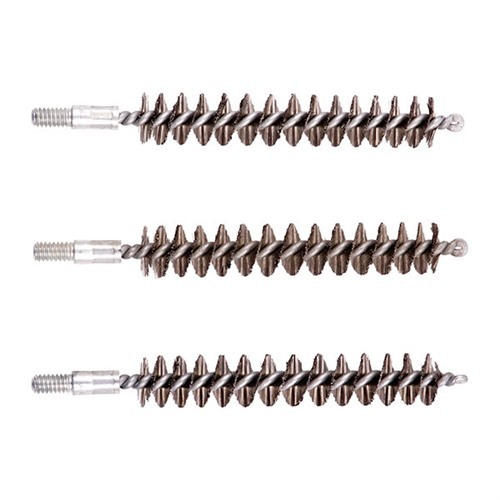 Since darn near as many bore brushes get used in the shop as get sold, we’ve packed these custom-made, top quality brushes in bulk paks to make them more convenient and less expensive. The shank is one-piece, looped and wound (not two, twisted together and chopped off). Stainless Steel Bore Brush - For severely leaded, fouled or rusted bores, the aggressive cleaning action of a stainless steel brush can help get them clean. However, the aggressive action accelerates wear, and regular use can shorten barrel life. SPECS: Bristles: Available in stainless steel. Shank: Steel, looped and wound. Overall length: 3.27" (8.3cm) Threads: .17 and.20 cal. 5-40 threads, all others 8-32 thread.