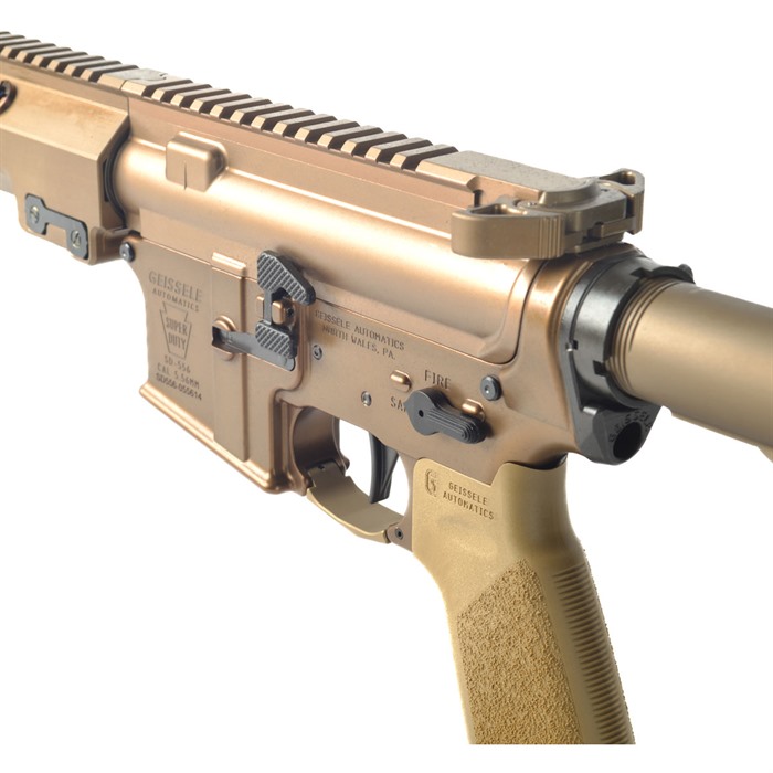 Super Duty MOD1 Rifle 5.56MM Semi-Auto Rifle The Super Duty Mod1 Rifle improves upon the renowned Geissele Super Duty with the addition of a HUXWRX Flash Hider-QD 556 suppressor-ready muzzle device, an updated MK16 Super Modular Rail with press-fit stainless steel Quick Disconnect (QD) inserts, an A17 Grip that presents a more ergonomic grip angle, and a QD Sling Mount Endplate. The SD Mod1 updates several key components that ensure this high-end rifle will continue to offer the user unmatched accuracy, comfort, and performance. Geissele provides the latest in weapon technology available. This rifle chambered in 5.56mm features a nanoweapon-coated HUXWRX Flash Hider-QD muzzle device pinned and welded to an in-house Manganese Phosphate coated, Cold Hammer Forged, Chrome Lined, 1-7 twist barrel. Geissele barrels are High-Pressure Tested (HPT) and Magnetic Particle Inspected (MPI). The Geissele length gas system and Geissele Super Compact Gas Block (with bomb-proof installation) ensure reliability and optimal performance in extreme conditions and heavy use. At your fingertip and purpose-built for precision is the SSA-E X with Lightning Bow® trigger. The Nanocoated, two-stage trigger features a wide-body and bow shape that finds the perfect balance between a classic M4 trigger and a flat-body trigger. At the heart of this rifle is the Geissele Reliability Enhanced Bolt Carrier Group (BCG). Their Nanoweapon-coated carrier features a properly torqued and staked, Chrome Lined, Nanocoated gas key. The Cam Pin is machined from advanced, tool steel known as H13 which is also coated with Nanoweapon for maximum corrosion and wear resistance. The Reliability Enhanced Bolt Carrier Group features extended upper rails, providing greater stability and dramatically increasing feeding reliability. The Reliability Enhanced Bolt Carrier Group comes with the Geissele Stressproof Bolt. Made from Carpenter 158+, directly developed with Carpenter Steel metallurgists to create a material that is cleaner and has fewer impurities. This makes our Stressproof bolt stronger and more fatigue-resistant. The Geissele Stressproof bolt is also forged, not machined from barstock. This allows us to optimize the grain structure of the steel to yield a bolt capable of 5 times the life of a mil-spec bolt. Each bolt is rigorously inspected, high-pressure tested, mag particle inspected and Nanoweapon coated. The Super Duty lower is precision machined from 7075-T6 aluminum and features Geissele’s Ultra Duty Lower Parts Kit featuring our Ambidextrous Super Configurable safety and Ultra Precision trigger guard. A high-quality mil-spec Geissele Buffer Tube with a Super-42 in H2 buffer ensures this rifle is properly tuned out of the box. Rounding up the package is a MK16 Super Modular Rail, that mates to the Super Duty Upper Receiver via a center aligning tab that removes any chance of rail rotation. The MK16 family of rails is renowned by operators for their performance and comfort. An Airborne Charging Handle ensures smooth and reliable operation. A Geissele Quick Disconnect (QD) Sling Mount Endplate allows for fast interfacing of slings quipped with QD pushbutton mounts to the lower receiver. This rugged and reliable attachment point is machined from Stainless Steel that is finished in Black Nitride and staked per MIL STD. The B5 Systems Enhanced Sopmod Stock completes the package and an Airborne Charging Handle ensures smooth and reliable operation. SPECIFICATIONS: CALIBER: 5.56MM COLOR: Black or DDC LOWER RECEIVER: Super Duty Lower Mil-Spec UPPER RECEIVER: Super Duty M4 Upper BCG: Reliability Enhanced Bolt Carrier Group BOLT: Geissele Stressproof Bolt RAIL: SMR MK16 w/ Geissele Center Tab TRIGGER: SSA-E X w/ Lightning Bow® BARREL: CHF, Chrome Lined, 1-7 Twist (Pin & Weld) - Geissele or Heavy Profile GAS BLOCK: Super Compact Gas Block CHARGING HANDLE: Airborne Charging Handle MUZZLE: HUXWRX Flash Hider- QD 556 LOWER PARTS KIT: Ultra Duty Lower Parts Kit BUFFER: Mil-Spec 6 Position, 7075-T6 BUFFER ASSEMBLY: Super-42 w/ H2 Buffer STOCK: B5 Systems Enhanced Sopmod Stock w/ QD Enplate GRIP: Geissele A17