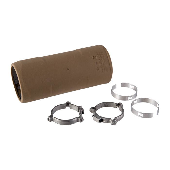 Being the first product of its kind, the Magpul Suppressor Cover 5.5” is able to stand up to the extreme temperatures caused by extended strings of fire while still protecting the user against burns by keeping internal can temperatures at safe levels and cool-off times short. The Magpul Suppressor Cover is a heat resistant polymer sleeve overlaid onto a raised stainless steel heat shield that directly mounts to the suppressor body with steel clamps. It minimizes heat transfer to keep external cover temperatures up to 1000 degrees F cooler than the surface of the suppressor by allowing high volumes of cooling airflow across the can. The Magpul Suppressor Cover 5.5” is also an enhanced thermal insulator and signature reduction device that mitigates negative visible mirage effects and also reduces external suppressor body impact damage. The Suppressor cover is developed for 1.5” outer diameter round suppressors with body length approximately 5.5”, not including the attachment hardware. Extreme temperature protection for body and gear Reduces thermal signature of host firearm High temperature polymer sleeve withstands extremely high suppressor temperatures during extended periods of firing without deterioration Available in black or medium coyote tan The Magpul Suppressor Cover 5.5” is a perfect addition to your range bag for easier handling of your suppressed firearm!