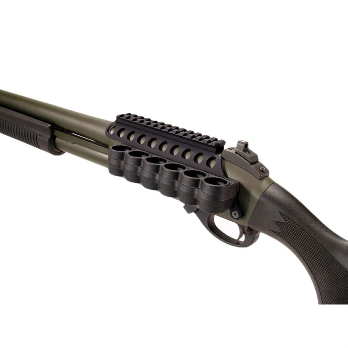 SPECS: Injection molded from glass filled polymer, lightweight aluminum backplate, matte black. For 12 gauge only. All models include mounting hardware, rubber gasket, and installation instructions. Right Hand models only. Remington Sidemount fits models 870/1100/11-87 (may require modification to gun). Rem 6-Round Sidemount – 6¼” (15.8cm) long x 1½” high. 5.4 oz. (152g) wt. Rem 8-Round Sidemount – 7¾” (19.7) long x 1½” high. 7 oz. (200g) wt. Remington Picatinny fits models 870/1100/11-87 (may require modification to gun). 7” (15.8cm) long x 2½” (6.3cm) high. 7.6 oz. (215g) wt. Mossberg fits models 500/590. 6-round ony. 6-3⁄8" (16.2cm) long x 1-3⁄8" (3.5cm) high. 5.2 oz. (147g) wt.Benelli Sidemount fits M1/M2/M3. Benelli 6-Round Sidemount – 6” (15.2cm) long x 2½” high. 6.3 oz. (179g) wt. Benelli Picatinny available for M2 (requires drilling tapping receiver to fit M1), M4/M1014, and Supernova. Benelli M2 6-Round Picatinny – 6” long x 2 (5.1cm)” high. 7.4 oz. (210g) wt. Benelli M4/M1014 6-Round Picatinny – 6” long x 2” (5.1cm) high. 7.5 oz. (213g) wt.