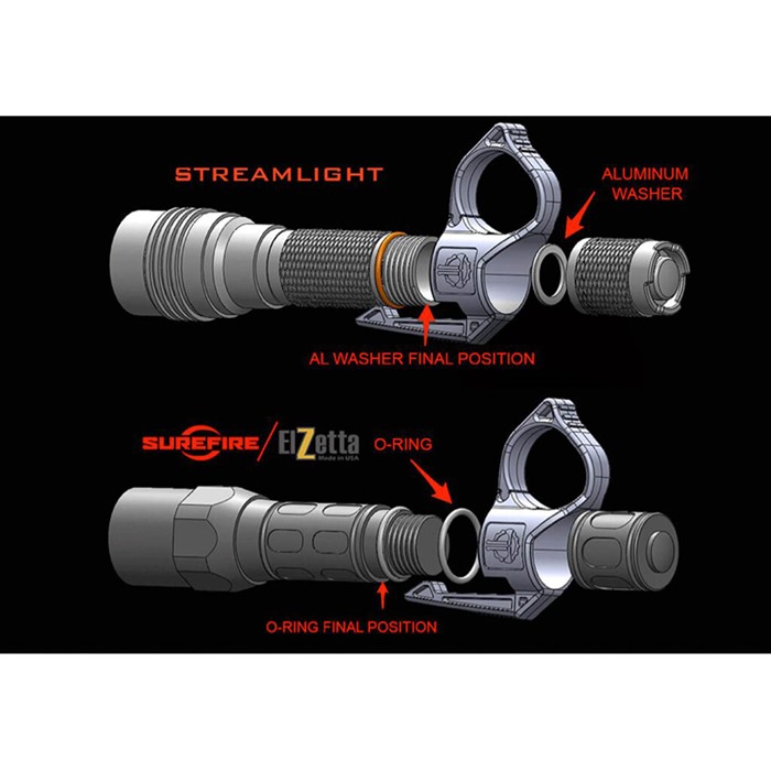 SWITCHBACK 2.0 LARGE FLASHLIGHT RING WITH POCKET CLIP The SwitchBack® 2.0 adds a multi-function finger ring and robust pocket clip to your tactical flashlight. It mounts securely between the light’s tailcap and body, providing a repeatable grip index during deployment from pocket or pouch, and enhances ergonomics while shooting or searching. The SwitchBack® 2.0 is the next evolution in the innovative SwitchBack Flashlight Ring product line. It incorporates new features and refinements based on thousands of hours of use by our subject matter experts and customers. The SwitchBack mounts between the tailcap and body of your flashlight, making it secure regardless of impact, moisture, and heat/cold changes. FEATURES: SwitchBacks can be used with handguns or long guns. It allows the user to: Reliably deploy and index a flashlight from both pockets and pouches, using the SwitchBack’s rigid, but releasable, retention ring. Shoot using a natural two-handed grip (the SwitchBack Technique). Employ all traditional low-light techniques such as Neck Index, Modified FBI, and Harries. Positively retain the light when drawing a firearm, reloading, and addressing a malfunction. The SwitchBack provides fast deployment and enhanced retention during many activities such as climbing, backpacking, car and home maintenance, and self-defense. New for SwitchBack 2.0: A finger ring that releases under heavy force/torque but can be reset. A stronger pocket clip that also works with MOLLE/PALS webbing. A pocket clip position that allows for slightly deeper carry than the SwitchBack® Large (original). A tubular portion that is cut lower to allow grip on both sides of the tail-cap during installation. A wider thumb rest with traction features. Small crush ribs on the SwitchBack 2.0’s lip that create a custom fit across a broader range of lights. An aluminum spacer that expands compatibility to Streamlight HL and HL-X flashlights and other manufacturers with similar designs. Installation For installation, first try installing the SwitchBack on your light without use of the O-ring or aluminum washer. Simply unscrew the tailcap, add the SwitchBack, and rescrew the tailcap back on. If the light does not activate upon use of the tailcap switch with the SwitchBack installed, try installing the aluminum washer as shown in the diagram below. Streamlight models tend to require the aluminum washer, but may not, depending on the tailcap features of the light. Elzetta and Surefire models do not usually require the aluminum washer, but users may find that addition of the rubber O-ring will help to stabilize the position of the SwitchBack