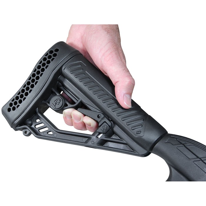 Il barrel insert rimovibile offre una vestibilità personalizzata per i standard tapered barrels e i .920” bull barrels. Ottieni una lunghezza di trazione personalizzata per una vestibilità adeguata e prestazioni migliorate con il calcio tipo M4 regolabile. Il design ergonomico presenta un recoil pad in gomma ventilata e rimovibile per migliorare il comfort.