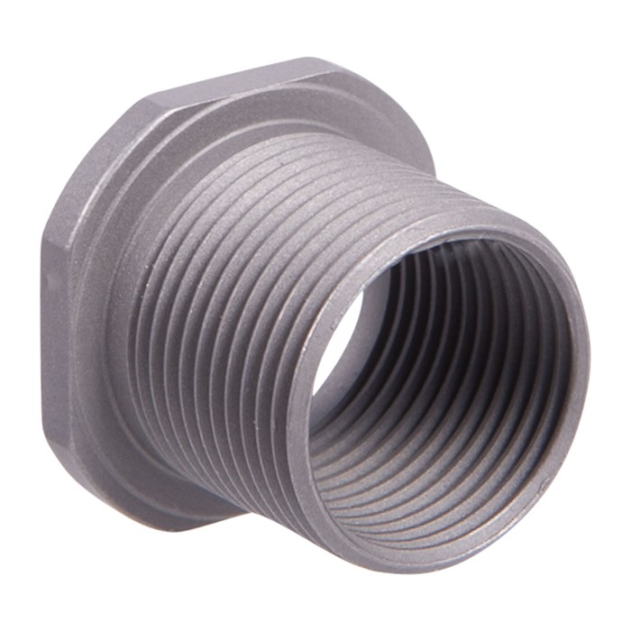 Machined from pre-hardened, stainless steel bar stock. Wrench flats on shoulder make installation and removal for use on multiple devices simple and easy. Compact design moves muzzle device only .100" forward maintaining full thread joint strength. All threads are single point cut in same operation to tight UNEF Class-3 tolerances for perfect concentricity and alignment. Allows attachment of 5/8-24 muzzle devices to a 9/16-24 threaded barrel.