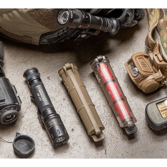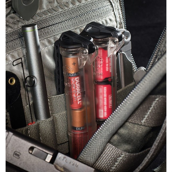CELLVAULT BATTERY STORAGE FOR AAA AND CR123 The CellVault Battery Storage is Thyrm’s original CellVault, a space-efficient way to keep your batteries and critical gear safe, dry and accessible. It can store three CR123, four AAA, or two AA batteries, as well as small survival supplies. The CellVault Battery Storage protects batteries and other critical gear while keeping it accessible and organized. Its integrated webbing clip allows you to access the CellVault’s contents without removing it, or you can quickly detach it for more control. This is the original CellVault size. FEATURES: Mounts to PALS, MOLLE, webbing, and straps Lanyard loops at both ends, for more attachment options Slim vertical profile less than 1 MOLLE webbing column, freeing up space for other gear including first aid kits, ammo, and tools Slightly decreasing diameter that can keeps CR123 batteries at the bottom of the CellVault secure even when the CellVault is inverted. Just squeeze the sides of the tube to release CR-123s in the middle or bottom of the CellVault. Waterproof, dustproof, durable exterior keeping your essentials safe and accessible Designed and manufactured in the USA Colors: black, Olive Drab, Rescue Orange, Flat Dark Earth, Urban Grey, or clear with black hinge. Viewable contents through clear model A CellVault can store: Three CR123 batteries Four AAA batteries Two AA batteries (leaving a little extra room) Small survival gear such as matches, hooks and line, a light stick, iodine tablets, a compass, and lip balm First aid gear including hemostatic clotting agents, tweezers, and bandages Consumables* such as medication, instant coffee packets, electrolyte powder, candy Emergency money and a Flash Drive Cigar/Cigarettes/chewing tobacco *If you plan to store consumables (medication, snacks) in the CellVault, wash it thoroughly and consider using a food-safe plastic bag. Clean it with a test tube or bottle brush. The CellVault is made with food-safe thermoformed plastic. This model of CellVault is not designed to be waterproof under prolonged submersion. Subsequently, it is not designed for diving. Users should check the lip and O-ring of the CellVault for debris or wear that could prevent it from being waterproof over time.