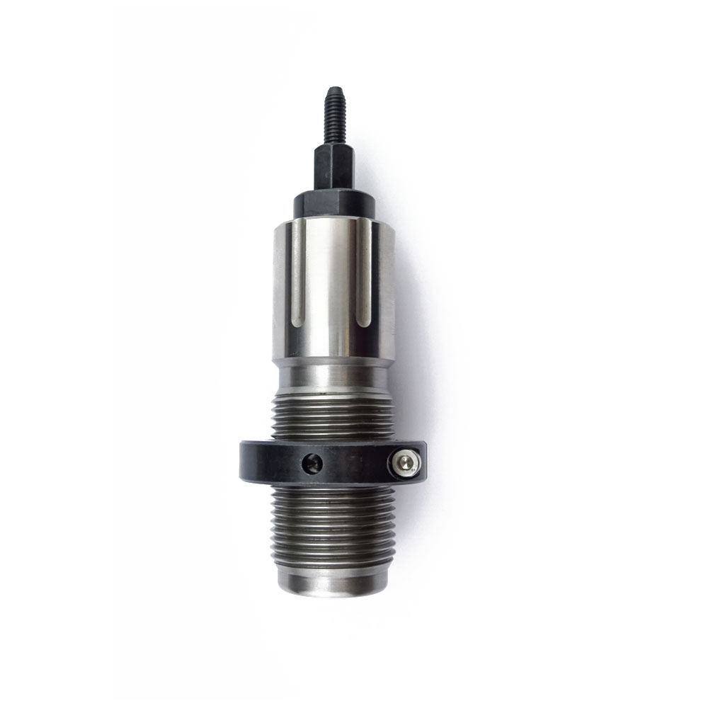 La calibrazione avviene quando il bossolo viene spinto all'interno del dies. Il collo del bossolo viene calibrato dall'interno quando viene estratto dal dies. Questo forma il bossolo e garantisce una corretta tensione del collo. La posizione corretta del dies nella pressa è impostata con il dado di bloccaggio.