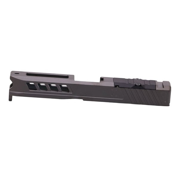 FNOTE: This specific slide is optic cut and ready for the RMR but does NOT include a cover plate and screw set (not needed for RMR/Optic use). These are priced under normal MSRP due to not including this plate. 100% US Manufactured and Designed. Cut for the Trijicon RMR optic and for other compatible mounting options and optics (no optic cover plate included). Cut from solid billet 17-4ph Certified Stainless Steel. Heat treated to spec. Attractive Side and Top Cut windows. Aggressive reduced & scalloped front. Angled rear serrations. Available in several finishes including: Satin Stainless, Black DLC, Stealth Grey PVD, Bronze TiCN, and Gold TiN. Fully functional with the Glock 19