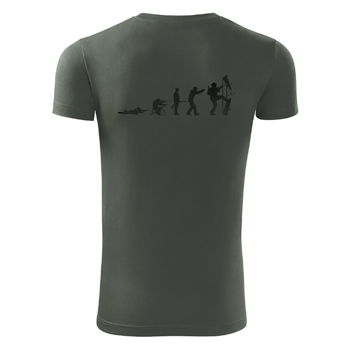 È una t-shirt di colore grigio ardesia scuro con il logo dei German Tactical Systems sul petto e la scritta GTS Evolution stampata sul retro.