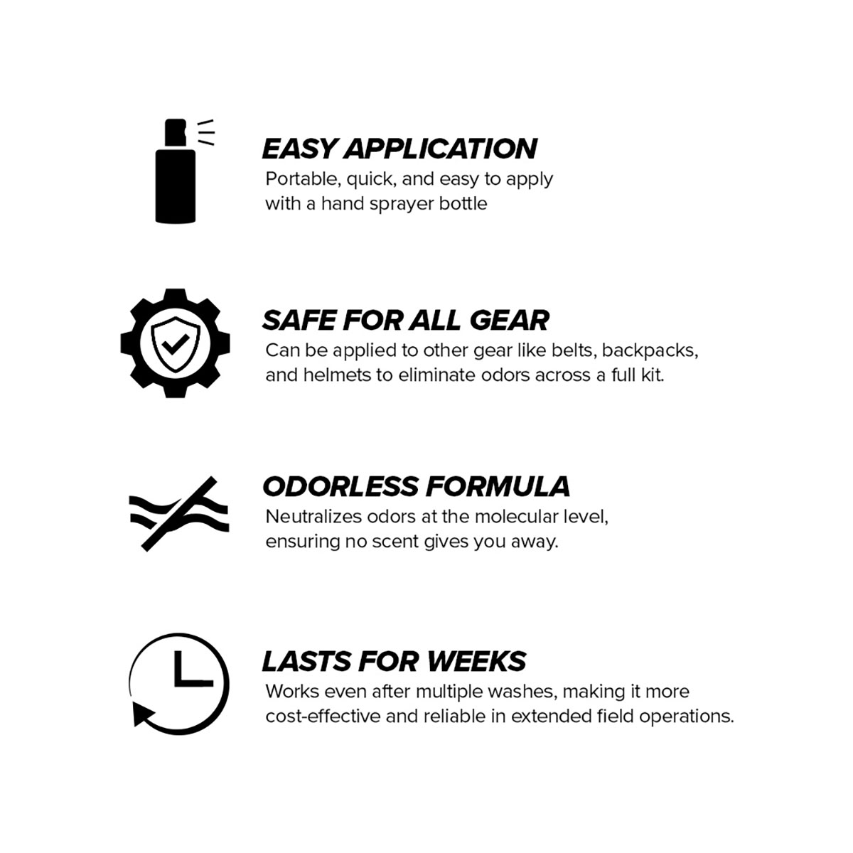 Come giubbotti, portacaricatori e uniformi, Scent Purge offre un controllo degli odori duraturo senza danneggiare la tua attrezzatura. Rimani comodo e pulito, indipendentemente da quanto duri l'allenamento.