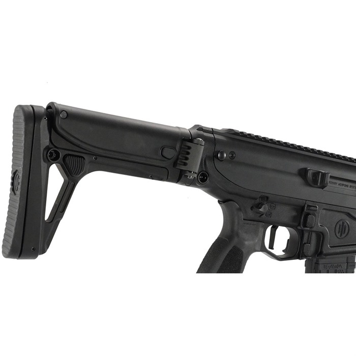 - XCHANGE Buttstock Module: Interfaccia di montaggio Picatinny/1913/STANAG, pieghevole con 6 posizioni di lunghezza regolabile per un’escursione di 2,5”, pulsante LOP ambidestro e anelli per cinghia QD, slot per cinghia in tessuto da 1”, pad di gomma per il comfort e completato con un supporto per guancia regolabile in altezza a 2 posizioni.