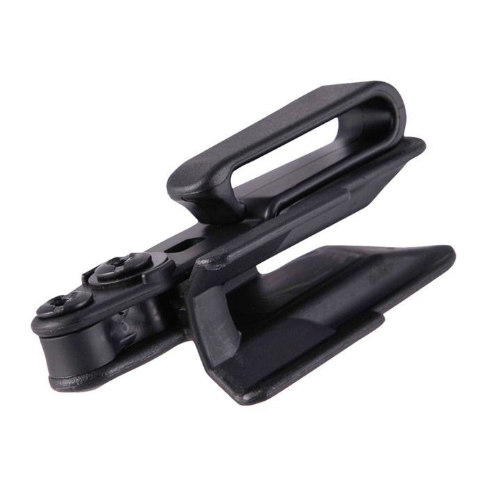 - Rimozione facile: L'holster può essere rimosso afferrando il naso dell'holster e facendo leva. Questo consente il dispiegamento dell'arma con una sola mano, anche se il tether o il punto di attacco non riescono a rimuovere l'holster.